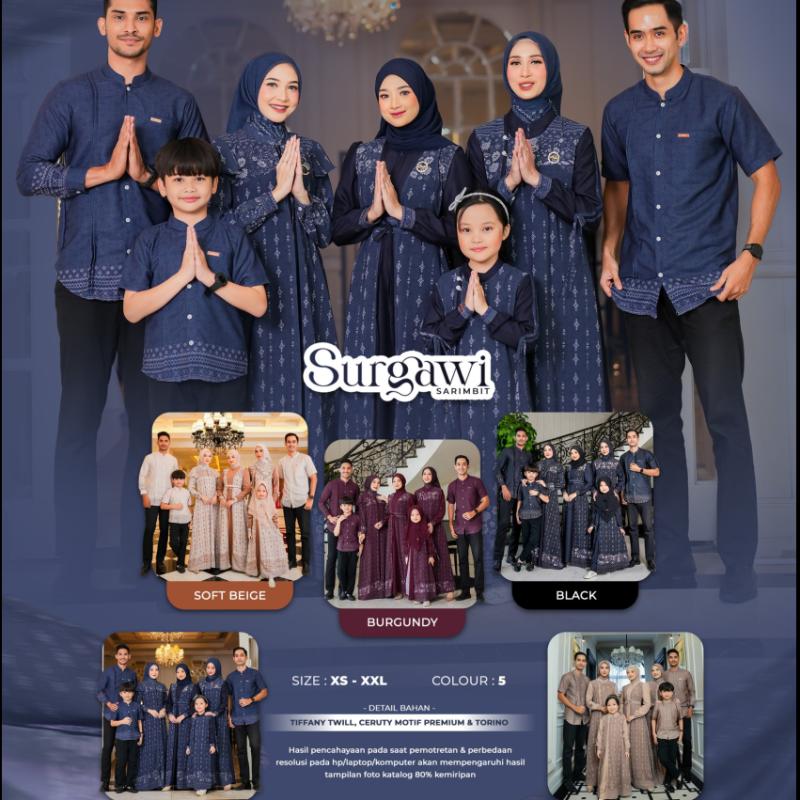 ? SURGAWI SARIMBIT BY AS MOSLEM X MOSLEM DAILY? Launching Now.. Open Pre Order.... Spesial mempersembahkan sarimbit istimewa yang hadir dengan desain fresh, anggun, dan penuh detail manis. Dibuat dari material premium pilihan yang lembut dan nyaman dipakai seharian? Sentuhan detail kancing brand menjadikan look-nya tampak lebih mewah dan berkelas? ° Material Gamis : ??? ??Bahan TIFFANY TWILL (Bahan premium yang berkualitas tinggi dengan karakteristik anyaman twill (garis diagonal halus) yang memberi tampilan lebih bertekstur, mewah, dan tidak pasaran. Kain ini memiliki permukaan yang lembut, tidak menerawang, adem serta nyaman dikulit dan jatuh. Sangat cantik saat dikenakan, menciptakan siluet anggun yang effortlessly stylish) ??Kombinasi ceruty premium dengan motif etnik floral geometris dengan ciri khas lembut dan flowy ° Material Koko : ??Bahan TORINO (Bahan premium yang memiliki kenyamanan dengan tekstur halus dengan serat yang rapat, tebal namun ringan, tidak menerawang, serta tidak mudah kusut, dan ketika dipakai memberikan looks yang formal, rapi serta elegant) ° Spesifikasi ??? ? Dress mom style 1 ??Model kerah Shanghai ??Busui Friendly - Resleting depan tersembunyi dengan detail hidden placket ??Bagian belakang didesain polos untuk kesan bersih dan anggun. ??Bagian depan didesain layer menyerupai outer (outer-look design) dengan potongan belahan tengah simetris (front opening) menggunakan material ceruty motif etnik floral-geometris. ??Aksen layer dijahit penuh di bagian kerah, menyatu secara permanen dengan gamis (non-lepas), menciptakan kesan seperti memakai outer tanpa perlu tambahan lapisan. ??Terdapat aksen ruffle kecil di pundak (memberi efek layering dan feminin) ??Lengan gamis straight Sleeve yang memberikan kesan feminim dan anggun ??Wudhu Friendly - desain lengan dengan manset ceruty motif etnik yang dilengkapi furing bagian dalam serta kancing brand dan plat tag eksklusif brand ??Terdapat saku fungsional dibagian kanan gamis ? Dress mom style 2 & Kids style 2 ??Didesain dengan gamis layer outer look dengan material utama tiffany twill ??Desain bagian belakang polos dengan ploi tengah (inverted pleat) yang memberikan efek flowy ??Bagian depan gamis didesain dengan asymmetric overlap outer look, menghadirkan kesan seperti outer silang yang menyatu dengan gamis ??Sisi kanan outer menumpuk ke sisi kiri secara asimetris dan menutup hingga leher, dikancing rapi menggunakan kancing brand di bahu kanan. ??Menggunakan material ceruty bermotif etnik floral-geometris sebagai aksen layer. ??Tepi outer dipercantik trimming polos berbahan Tiffany Twill, memberikan kesan bersih dan mewah. ??Layer outer menyatu dengan gamis (non removable), praktis namun tetap stylish. ??Menggunakan kerah Shanghai ??Busui Friendly – Dilengkapi dengan resleting depan tersembunyi (hidden placket) ??Model lengan lurus (straight sleeve) dengan aksen dua lis kombinasi ceruty motif etnik yang bertemu dan dapat diikat sebagai tali pita dekoratif. ??Wudhu friendly – dilengkapi manset dengan bukaan kancing brand serta plat tag brand eksklusif ??Terdapat saku fungsional dibagian kanan gamis. ? Dress mom style 3 ??Material Inner :Tiffany Twill polos yang memiliki tekstur halus, jatuh elegan, dan nyaman dipakai ??Menggunakan kerah Shanghai ??Busui Friendly - Resleting depan tersembunyi dengan detail hidden placket ??Lengan gamis puff sleeve memberikan kesan feminim dan anggun ??Wudhu Friendly- didesain dengan manset kombinasi ceruty motif etnik, dilengkapi kancing brand bukaan praktis dan plat tag eksklusif brand ??Terdapat saku fungsional di bagian kanan gamis ??Removable Outerwear (Outer Terpisah) dengan bahan ceruty premium motif etnik floral geometris khas yang elegan. ??Bagian tepi outer dipercantik dengan trimming polos dari bahan Tiffany Twill, menciptakan kontras yang elegan dan mempertegas siluet luar. ??Belt terpisah dengan motif etnik floral geometris, dipadukan tali Tiffany Twill polos sebagai aksen kontras yang classy