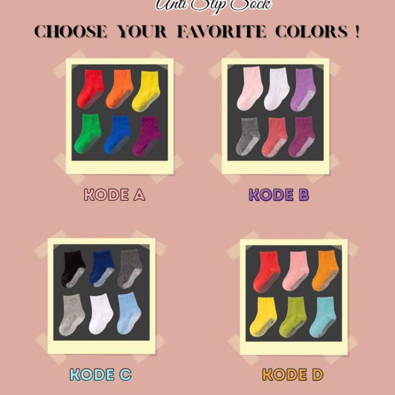 ?ELIN ANTI-SLIP SOCK? Kaos kaki anti slip dirancang khusus untuk anak2 untuk kegiatan sekolah, olahraga, dan bermain. Dengan tambahan anti slip pada telapak kaki, anak lebih aman dan nyaman saat bergerak di lantai yg licin ? ?Detail: - bahan katun - terdapat anti slip dot - bahan lembut dan elastis - design simple - varian warna beragam - terdapat 4 set pilihan warna, satu set terdiri dari 6 warna ?Size : - S untuk anak usia 0-1 tahun - M untuk anak usia 1-3 tahun - L untuk anak usia 4-6 tahun - XL untuk anak usia 7-9 tahun ? Price : Rp 69.000,- / set ( 1 set isi 6 pasang sesuai variasi ) Happy shopping ??
