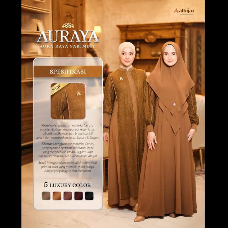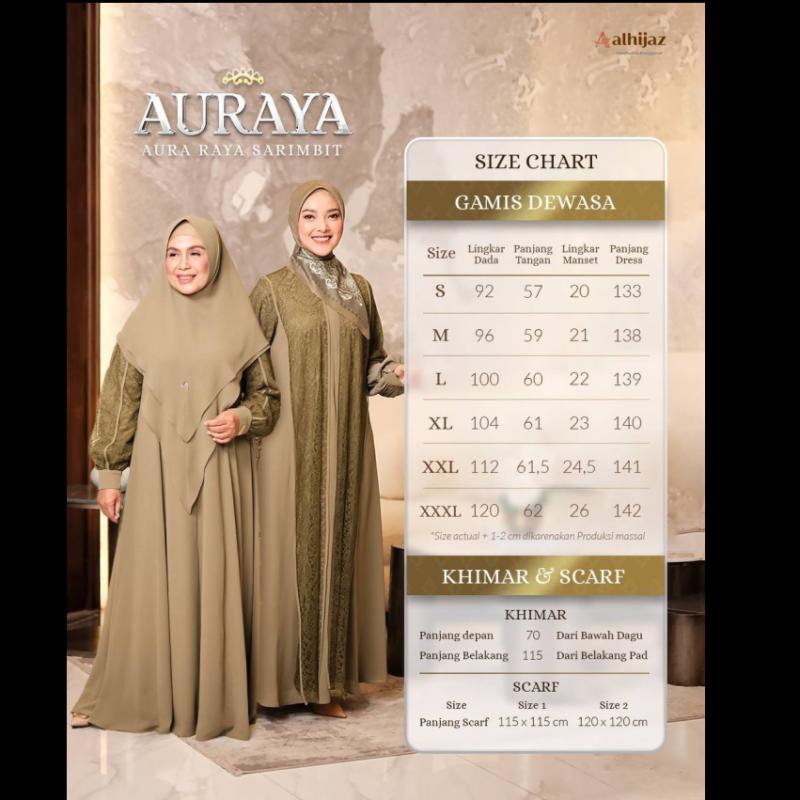 AURAYA Aura Raya Sarimbit DESKRIPSI SPESIFIKASI GAMIS Gamis, menggunakan material Ceruty yang lembut dan mempunyai kesan jatuh dikombinasikan dengan brukat cantili yang indah memberikan kesan Luxury & Elegant SPESIFIKASI KHIMAR Khimar, menggunakan material Ceruty yang nyaman serta memiliki dual layer dan sudah terpasang free golden tag logo Alhijaz yang menambah kesan elegan pada khimar SPESIFIKASI SCARF Scarf, menggunakan material Ultrafine Voal printed scarf yang memiliki motif bunga Alhijaz yang anggun dan menawan SPESIFIKASI KOKO Koko, menggunakan material Dobby yang memiliki tekstur lembut dan pola yang unik seperti ketupat, memberikan kesan luxury dan elegant. - Koko Pendek, menggunakan kerah chiang-i dan terdapat saku kiri dan kanan. - Koko Panjang, Terdapat kerah dibagian atas dan kancing di lengan kiri dan kanan.